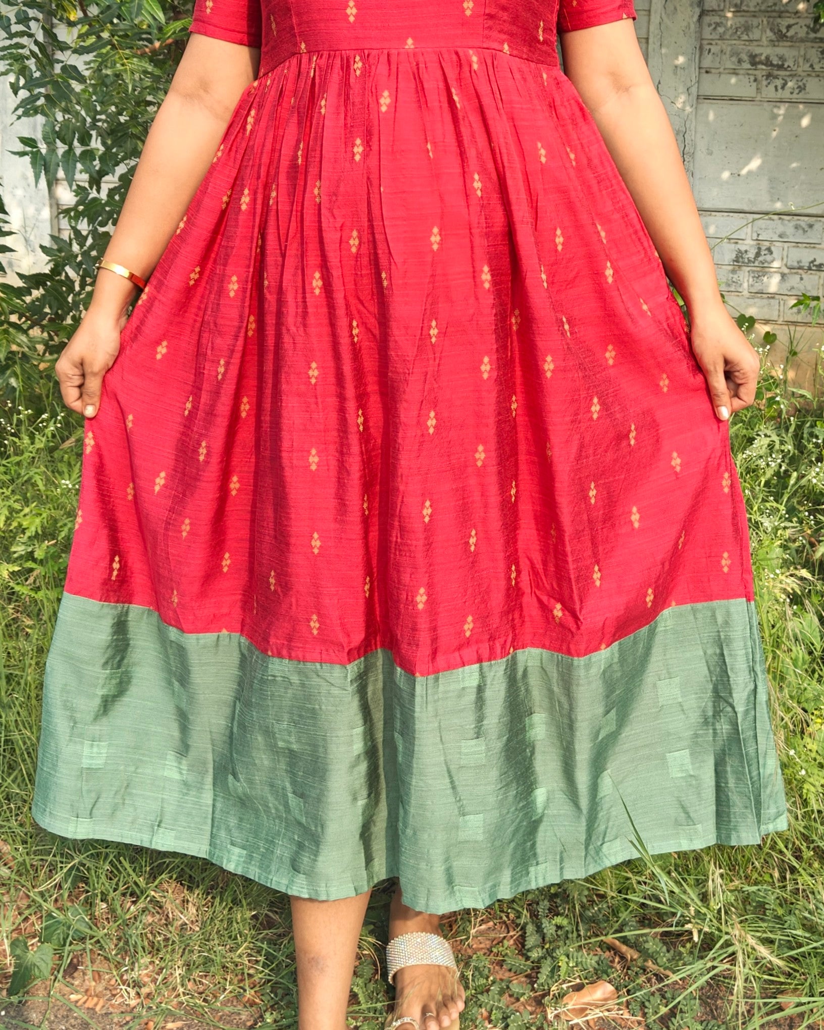 This Roja frock features a rich rose-red body with a soothing mint green border — crafted for comfort, grace, and timeless beauty. ✨
